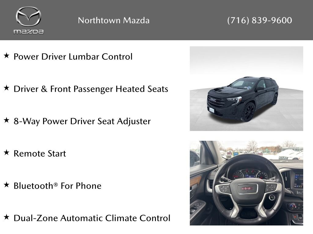 See the rest of our inventory at: NORTHTOWN MAZDA.COM Driver Convenience Package (8-Way Power Driver Seat Adjuster, Driver & Front Passenger Heated Seats, Dual-Zone Automatic Climate Control, Power Driver Lumbar Control, Remote Start, and Roof-Mounted Luggage Rack Black Side Rails), Elevation Edition (Black GMC Center Caps w/Black GMC Lettering, Black Mirror Caps, Darkened Front Grille, and Wheels: 19" x 7.5" Gloss Black Painted Aluminum), License Plate Front Mounting Package, Preferred Equipment Group 3SA, 2 USB Data Ports w/Auxiliary Input Jack, 3.47 Axle Ratio, 4-Way Manual Driver's Seat, 4-Way Manual Front Passenger Seat, 4-Wheel Disc Brakes, 6 Speakers, 6-Speaker Audio System Feature, ABS brakes, Air Conditioning, Alloy wheels, AM/FM radio, Apple CarPlay/Android Auto, Auto High-beam Headlights, Auto-dimming Rear-View mirror, Bluetooth® For Phone, Brake assist, Bumpers: body-color, Compass, Delay-off headlights, Driver door bin, Driver vanity mirror, Dual front impact airbags, Dual front side impact airbags, Electronic Stability Control, Emergency communication system: OnStar and GMC connected services capable, Exterior Parking Camera Rear, Four wheel independent suspension, Front & Rear Black GMC Emblems (LPO), Front anti-roll bar, Front Bucket Seats, Front Center Armrest, Front reading lights, Fully automatic headlights, Heated door mirrors, High-Intensity Discharge Headlights, Illuminated entry, Lane Departure Warning System, Low tire pressure warning, Occupant sensing airbag, Outside temperature display, Overhead airbag, Overhead console, Panic alarm, Passenger door bin, Passenger vanity mirror, Power door mirrors, Power Programmable Rear Liftgate, Power steering, Power windows, Premium Cloth Seat Trim, Radio data system, Radio: GMC Infotainment Audio System w/7" Display, Rear anti-roll bar, Rear seat center armrest, Rear window defroster, Rear window wiper, Remote keyless entry, Security system, Speed control, Speed-sensing steering, Split folding rear seat, Spoiler, Steering wheel mounted audio controls, Tachometer, Telescoping steering wheel, Tilt steering wheel, Traction control, Trip computer, Variably intermittent wipers, and Wheels: 17" x 7" Silver Painted Aluminum.