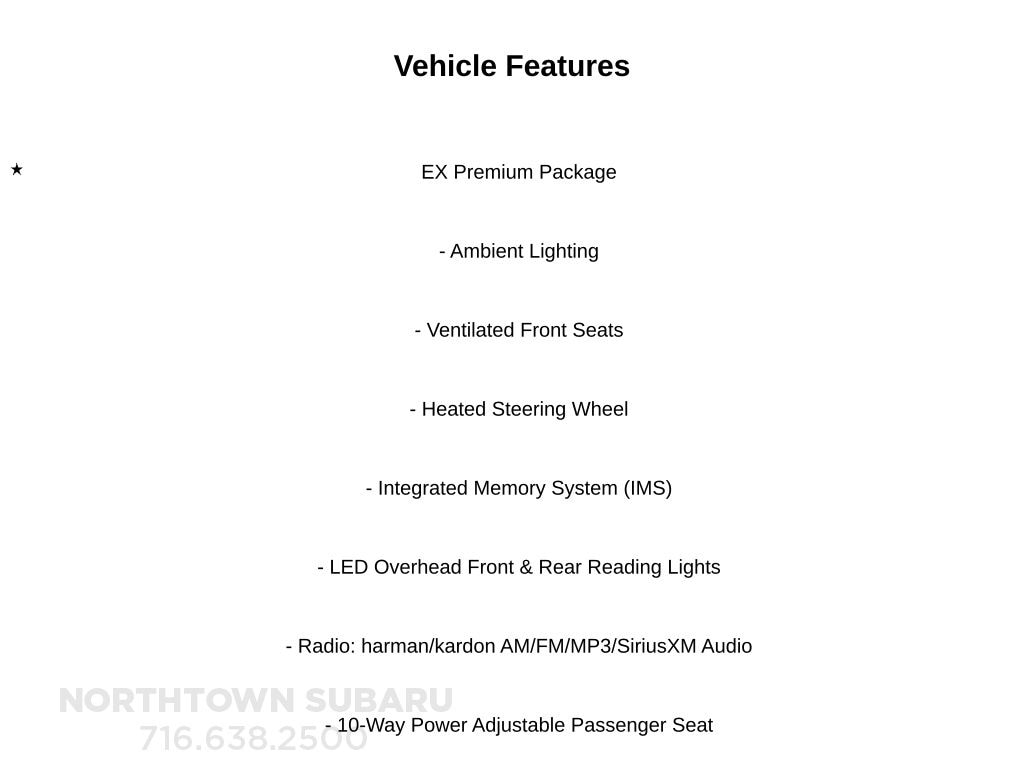 See the rest of our inventory at: NORTHTOWNSUBARU.COM EX Premium Package (10-Way Power Adjustable Passenger Seat, 12-Way Power Adjustable Driver's Seat, Ambient Lighting, Heated Steering Wheel, Integrated Memory System (IMS), LED Overhead Front & Rear Reading Lights, Panoramic Sunroof, Radio: harman/kardon AM/FM/MP3/SiriusXM Audio, and Ventilated Front Seats), Black Leather, 4-Wheel Disc Brakes, 6 Speakers, ABS brakes, Air Conditioning, Alloy wheels, AM/FM radio: SiriusXM, Anti-whiplash front head restraints, Apple CarPlay & Android Auto, Auto High-beam Headlights, Auto-dimming Rear-View mirror, Automatic temperature control, Brake assist, Bumpers: body-color, Cargo Net, Delay-off headlights, Driver door bin, Driver vanity mirror, Dual front impact airbags, Dual front side impact airbags, Electronic Stability Control, Emergency communication system: UVO eServices, Four wheel independent suspension, Front anti-roll bar, Front Bucket Seats, Front Center Armrest, Front dual zone A/C, Front fog lights, Front reading lights, Fully automatic headlights, Heated door mirrors, Heated Front Bucket Seats, Heated front seats, Illuminated entry, Knee airbag, Leather Seat Trim, Leather Shift Knob, Leather steering wheel, Low tire pressure warning, Occupant sensing airbag, Outside temperature display, Overhead airbag, Overhead console, Panic alarm, Passenger door bin, Passenger vanity mirror, Power door mirrors, Power driver seat, Power steering, Power windows, Radio data system, Radio: AM/FM/MP3/SiriusXM Audio System, Rear anti-roll bar, Rear seat center armrest, Rear window defroster, Remote keyless entry, Security system, Speed control, Speed-sensing steering, Split folding rear seat, Steering wheel mounted audio controls, Tachometer, Telescoping steering wheel, Tilt steering wheel, Traction control, Trip computer, Turn signal indicator mirrors, Variably intermittent wipers, and Wheels: 6.5J x 17" Machine Finish Alloy.
