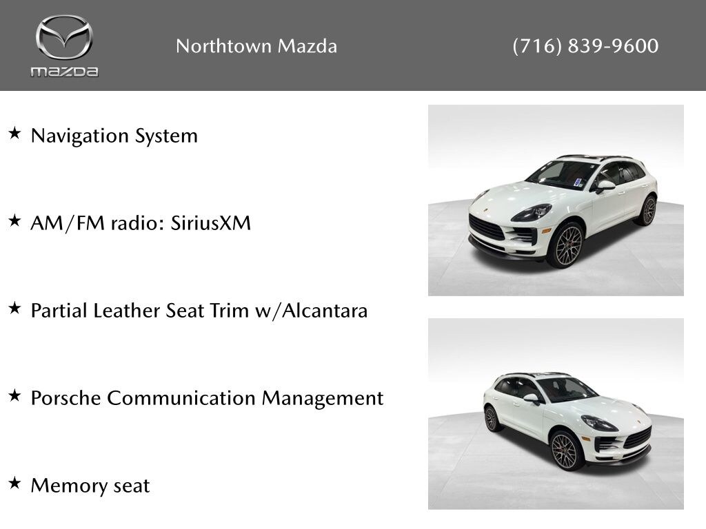 See the rest of our inventory at: NORTHTOWN MAZDA.COM Memory Package, AM/FM radio: SiriusXM, Brake assist, Electronic Stability Control, Exterior Parking Camera Rear, Heated door mirrors, Memory seat, Navigation System, Partial Leather Seat Trim w/Alcantara, Porsche Communication Management, Power Liftgate, Rain sensing wipers, Sport steering wheel, 10 Speakers, 4-Wheel Disc Brakes, 8-Way Power Seats, ABS brakes, Air Conditioning, Alloy wheels, Automatic temperature control, Axle Ratio: 4.13, Bumpers: body-color, Delay-off headlights, Driver door bin, Driver vanity mirror, Dual front impact airbags, Dual front side impact airbags, Four wheel independent suspension, Front anti-roll bar, Front Bucket Seats, Front Center Armrest, Front dual zone A/C, Front fog lights, Front reading lights, Fully automatic headlights, Garage door transmitter: HomeLink, Illuminated entry, Leather Shift Knob, Low tire pressure warning, Occupant sensing airbag, Outside temperature display, Overhead airbag, Overhead console, Panic alarm, Passenger door bin, Passenger vanity mirror, Power door mirrors, Power driver seat, Power passenger seat, Power steering, Power windows, Radio data system, Rear air conditioning, Rear anti-roll bar, Rear reading lights, Rear seat center armrest, Rear side impact airbag, Rear window defroster, Rear window wiper, Remote keyless entry, Security system, Speed control, Speed-sensing steering, Split folding rear seat, Spoiler, Steering wheel mounted audio controls, Tachometer, Telescoping steering wheel, Tilt steering wheel, Traction control, Trip computer, Turn signal indicator mirrors, Variably intermittent wipers, and Wheels: 19" Macan Design.